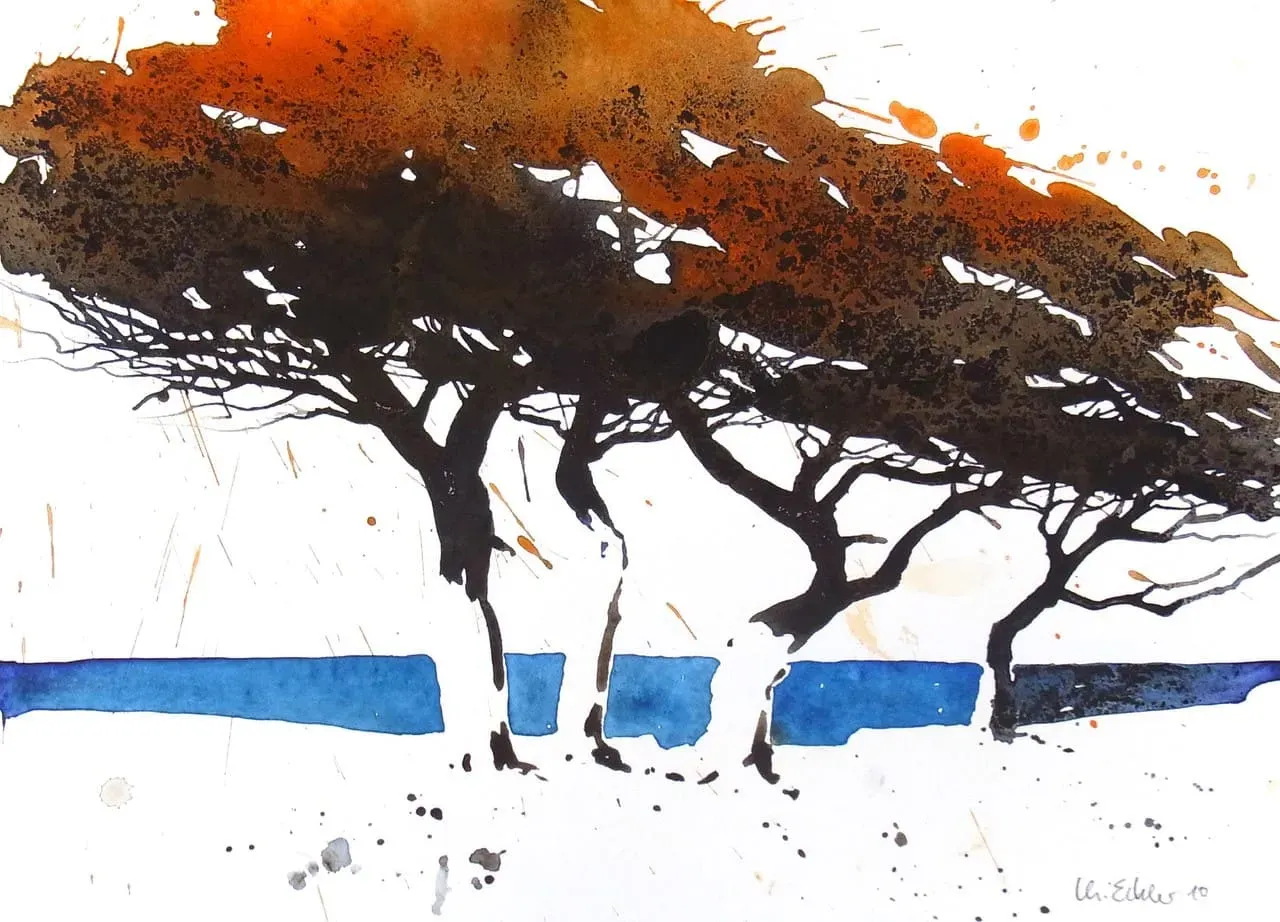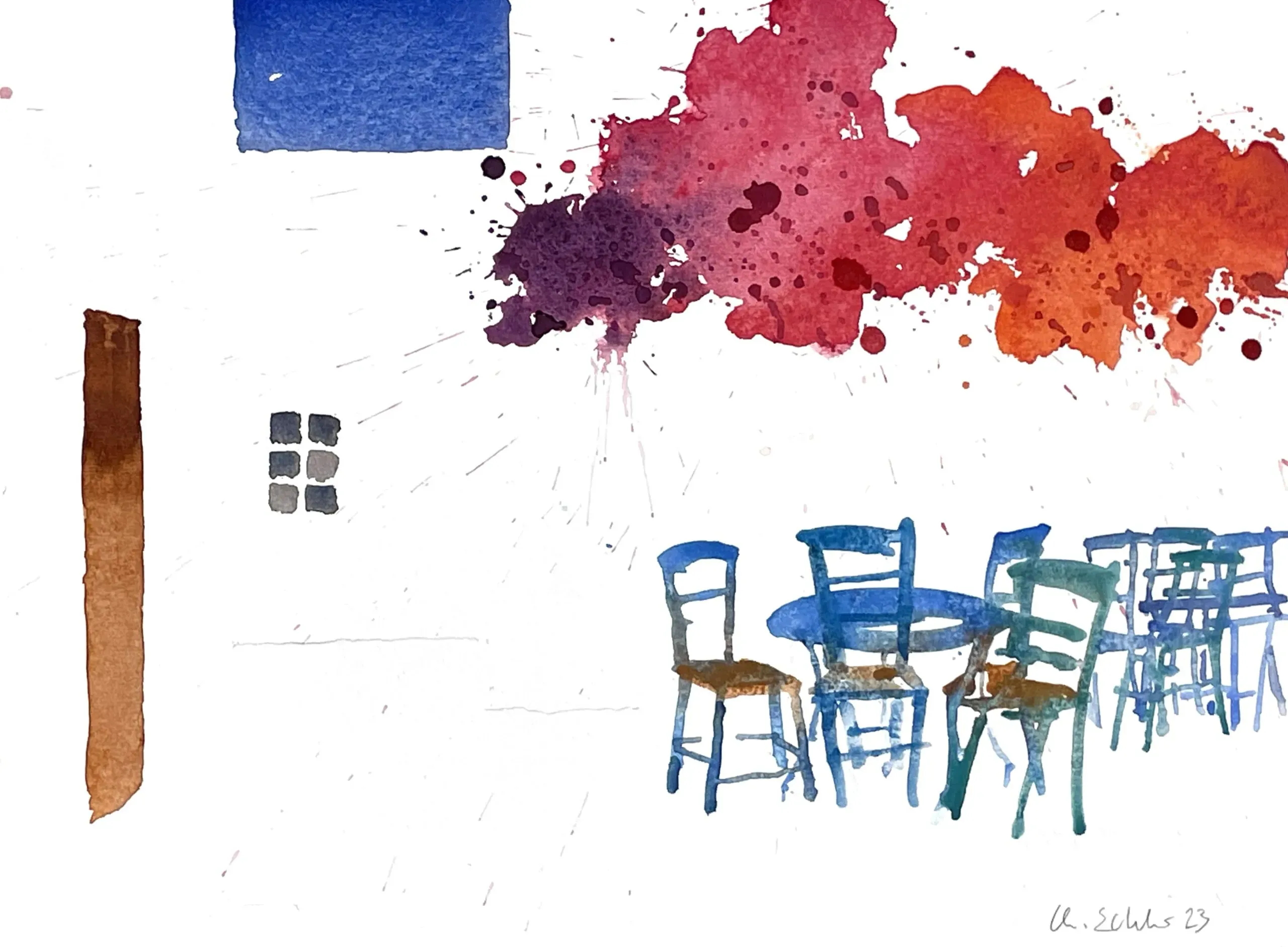 Das Nicht-Gemalte, also das unbemalte weiße Papier, soll in diesem Kurs eine tragende Rolle spielen und in Korrespondenz mit den umgebenden Flächen seine Bedeutung erhalten. Angedeutetes und Weggelassenes provoziert die Fantasie des Betrachters, der damit zum Mitgestalter des Bildes wird. Sparsam, aber kräftig eingesetzte Farbflecken bringen das Gemalte zu intensivem Leuchten. Leichtigkeit und Transparenz sind die prägenden Merkmale dieser Malerei. Ungewohnte Techniken wie Klatschen, Spritzen, Schleudern, Schütten und Auswaschen lassen den Malprozess zur Gratwanderung zwischen Zufall und bewusster Steuerung werden.