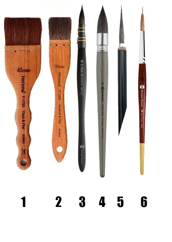 Matériel : J’utilise des pinceaux moyens en poils naturels et synthétiques. Pinceaux chinois/japonais pour les détails.