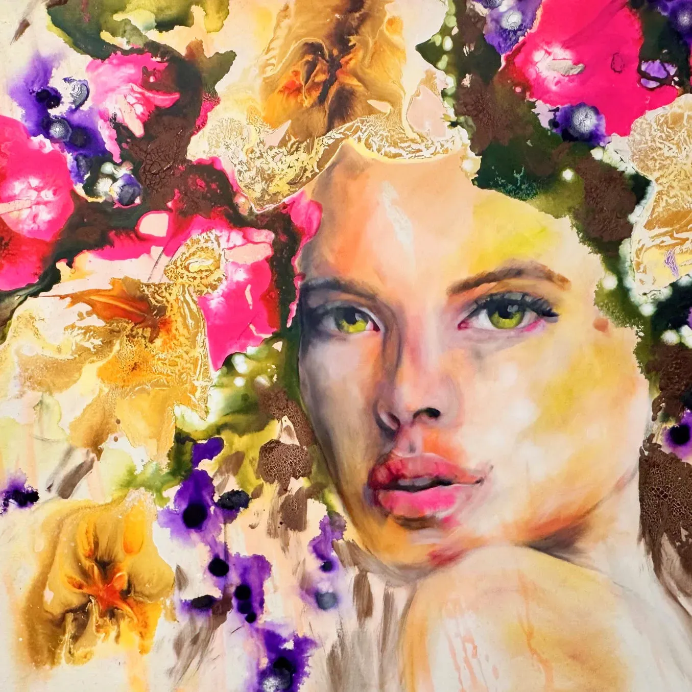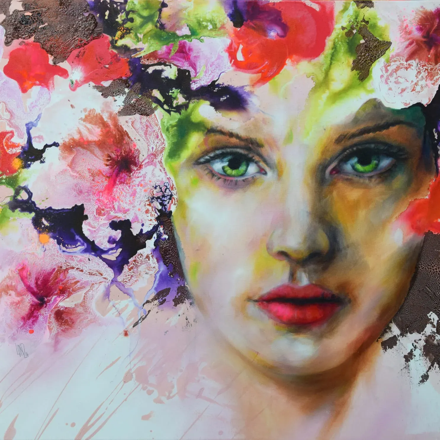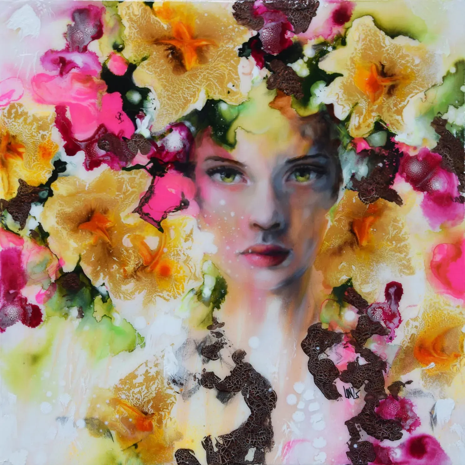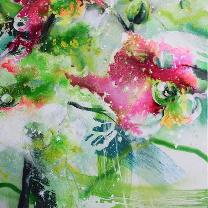 Beginnend mit einer sehr einfachen Grundierung in Acryl geht es bereits an die Zeichnung unseres Motivs. Anschließend heißt es SPIELwiese – im wahrsten Sinne des Wortes. In mehreren Arbeitsgängen arbeiten mir mit unterschiedlichen flüssigen Produkten und lassen daraus ein wahres Blütenmeer wachsen. Ilona hat dazu eine eigene, sehr spezielle Technik entwickelt. In lebendiger Ölmalerei wird unser Motiv später in diesen fantastischen FLOW gemalt – Portraits, Menschen, Tiere – alles, was du in deinem persönlich Blütenmeer einbetten möchtest. Wir verbinden, spielen, zaubern – bis ein traumhaft schönes, äußerst kostbares lebendiges Ganzes entsteht.